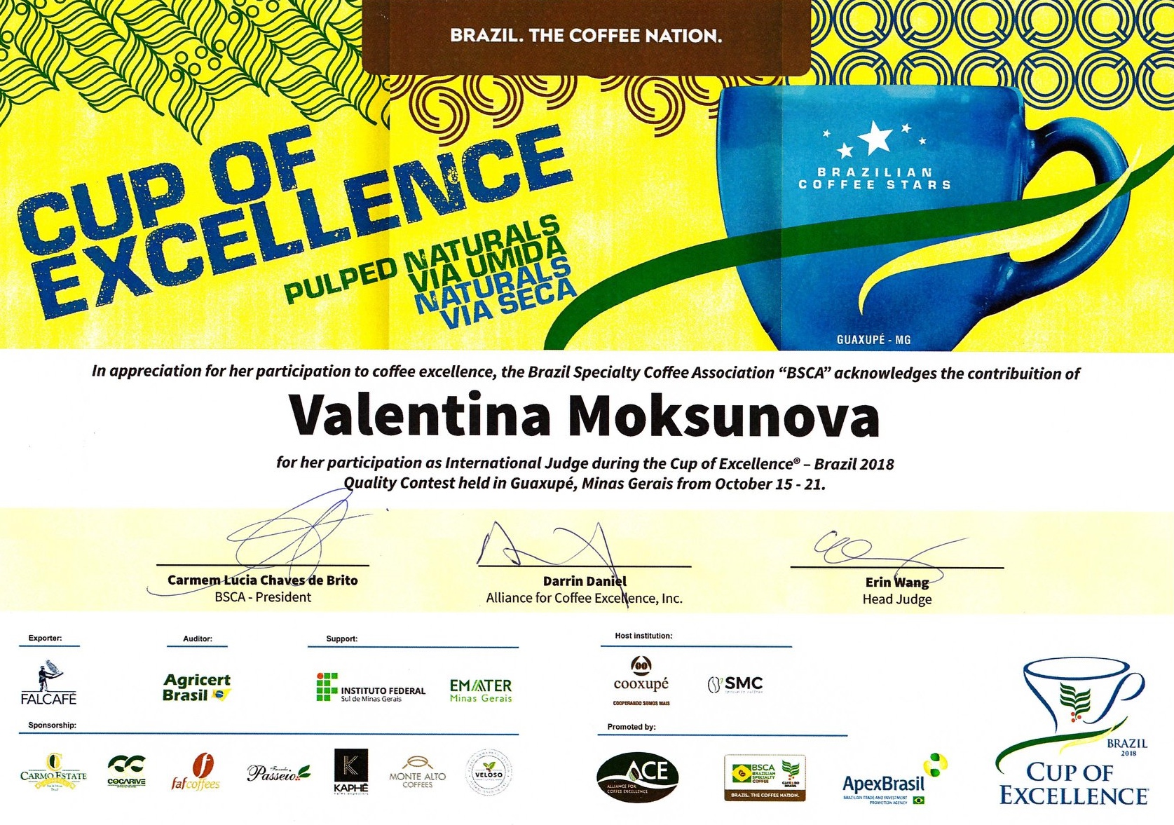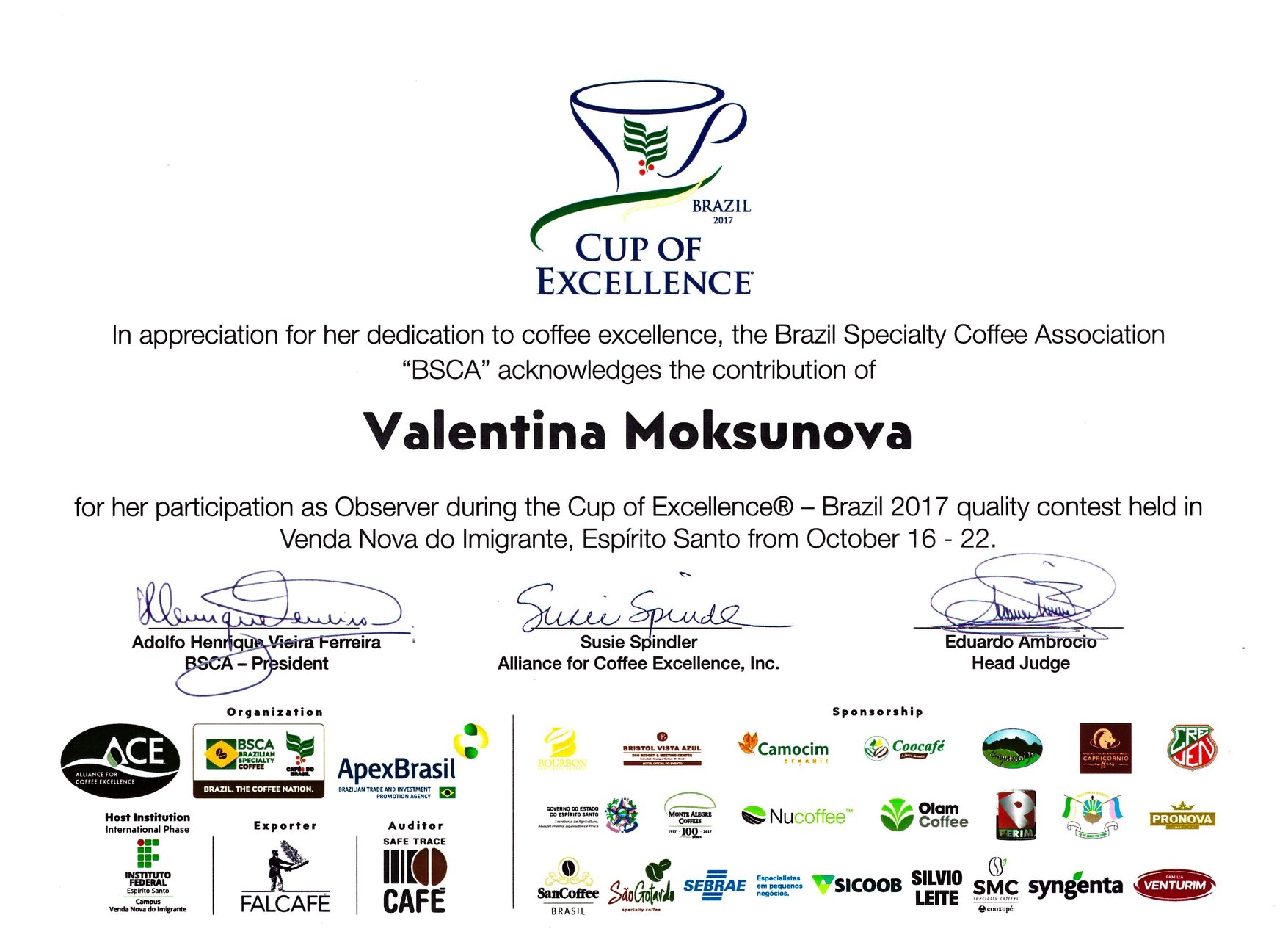 Сертификат подтверждающий участие Валентины Моксуновой в Cup of Excellence Brazil-2017 в качестве судьи-наблюдателя.