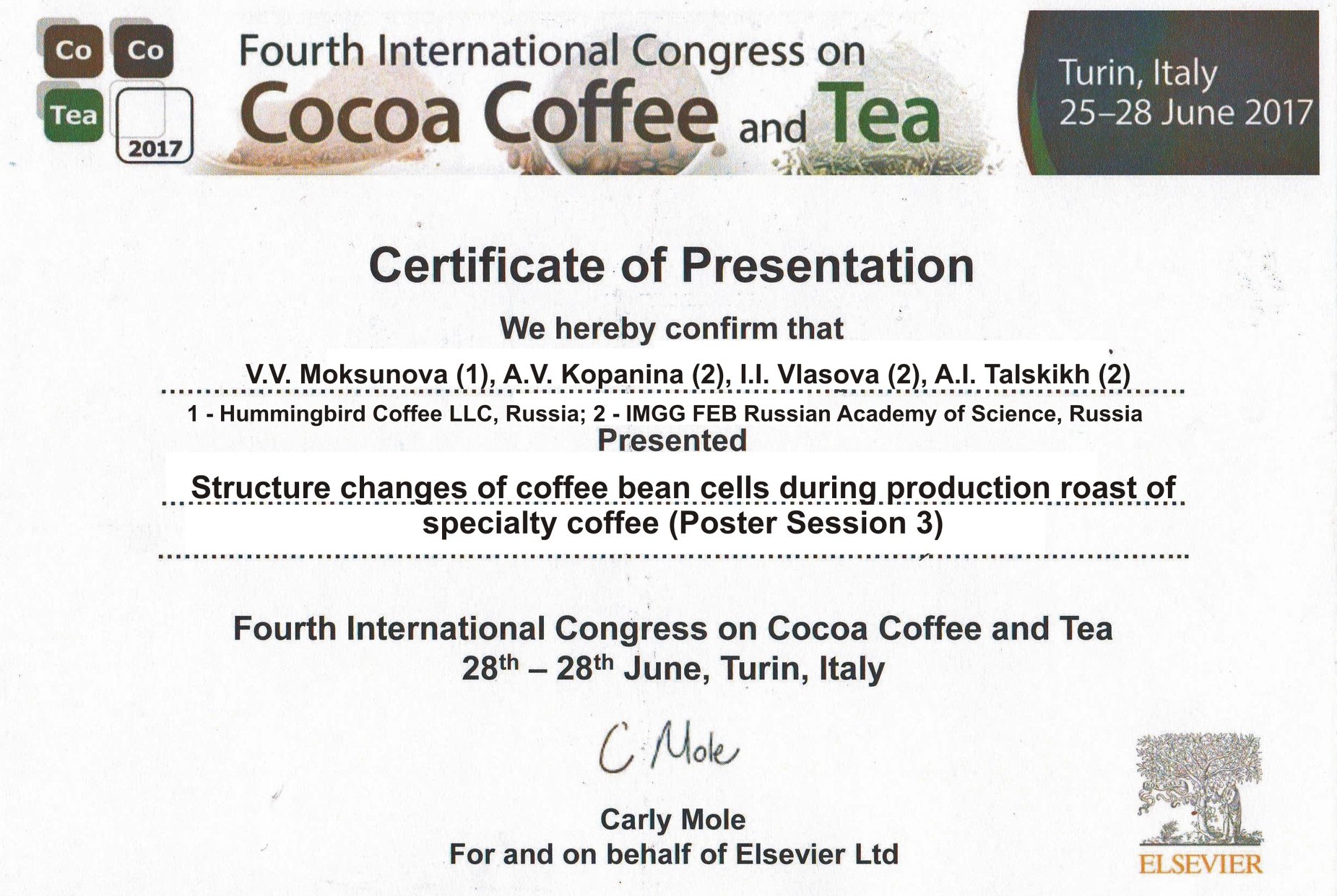 Сертификат выдан В.В. Моксуновой (ООО "Колибри кофе"), А.В. Копаниной, И.И. Власовой, А.И. Талцких (ИМГиГ ДВО РАН, Россия) за участие с докладом на тему "Структурные преобразования в клетках кофейных зерен во время производственной обжарки спешелти кофе" на Четвертом международном конгрессе по какао, кофе и чаю (Турин, Италия, 2017 год).