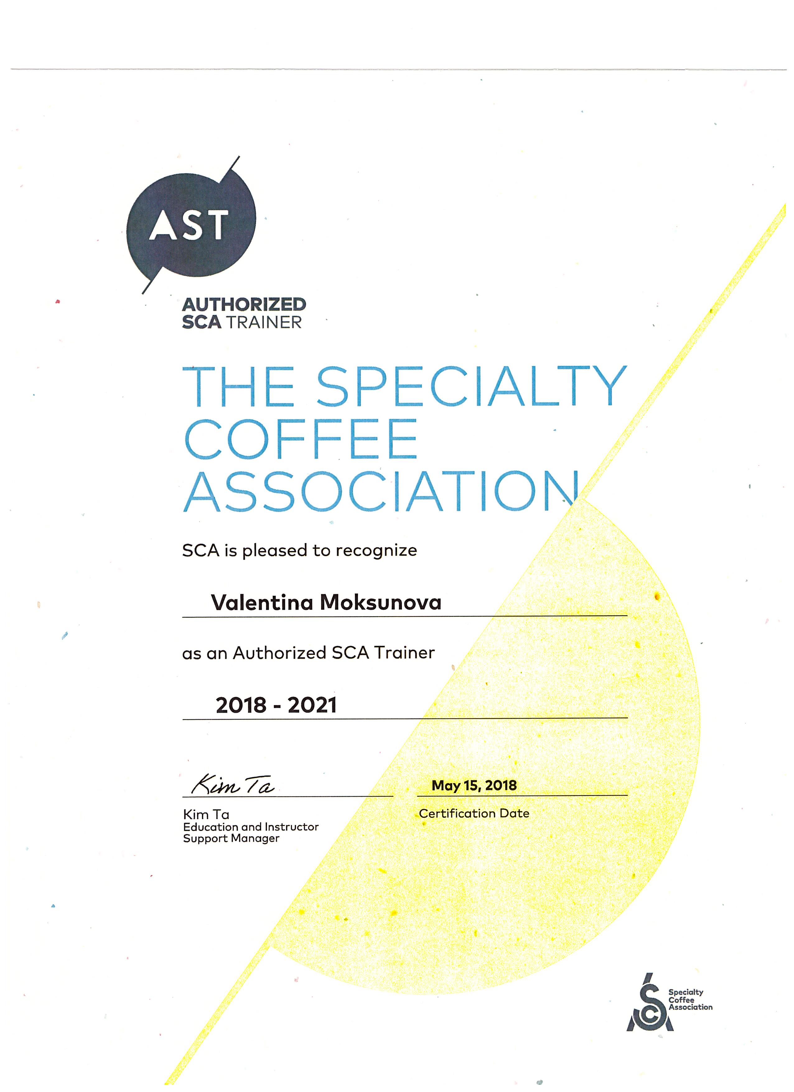 Сертификат подтверждающий, что Валентина Моксунова является авторизованным тренером Ассоциации Спешелти Кофе (AST) на период с 2018 - 2021
