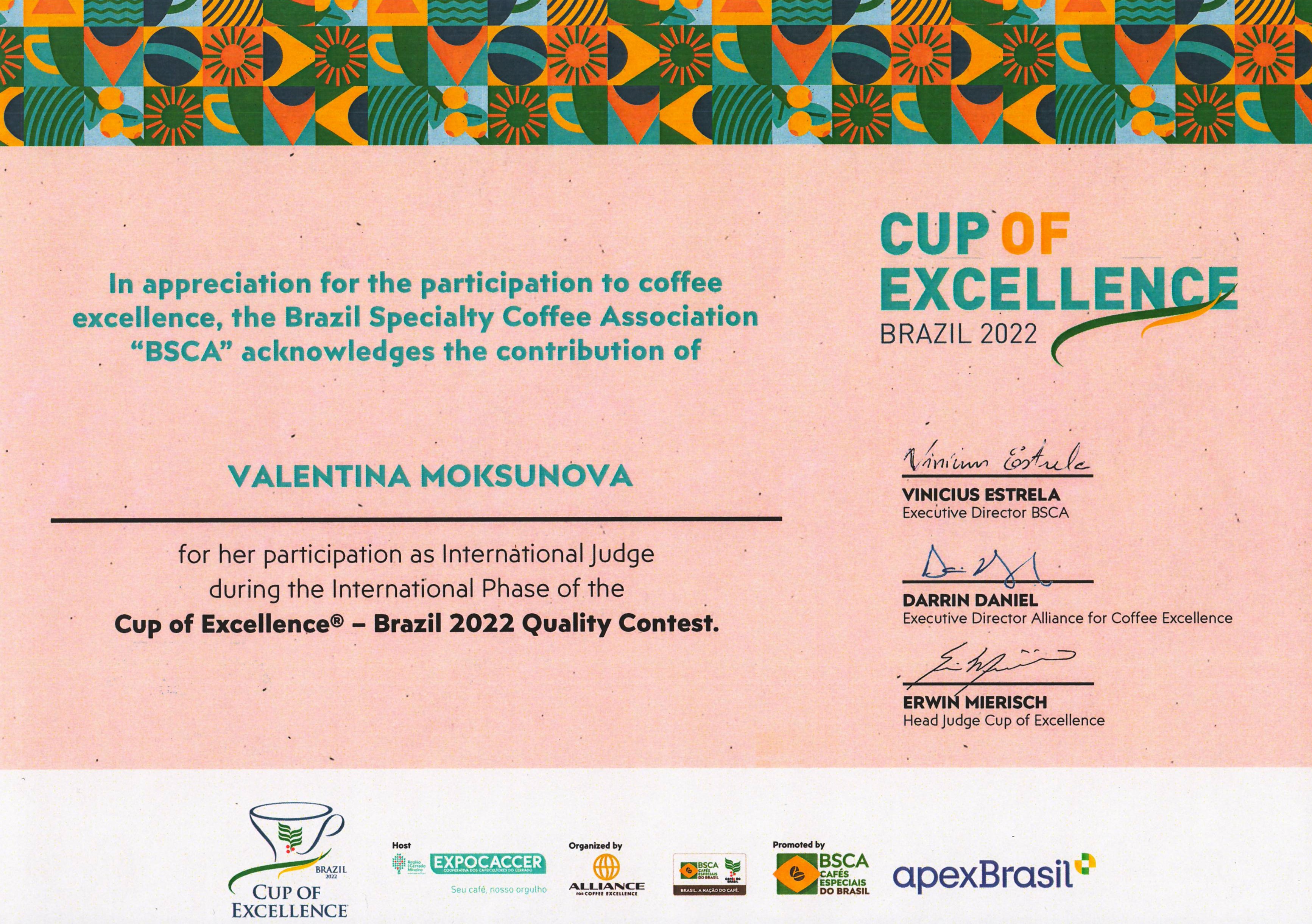 Сертификат судьи Cup of Excellence Brazil 2018