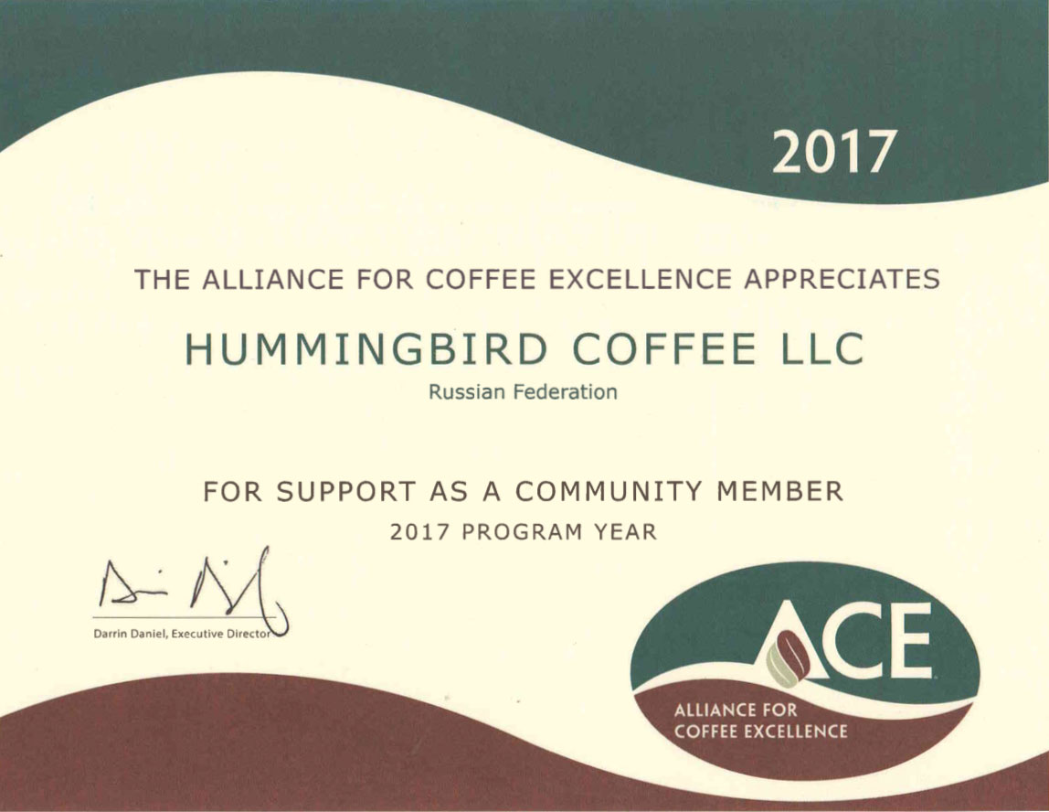 Сертификат подтверждающий, что компания "Колибри кофе" является членом The Alliance for Coffee Excellence c 2017 года.