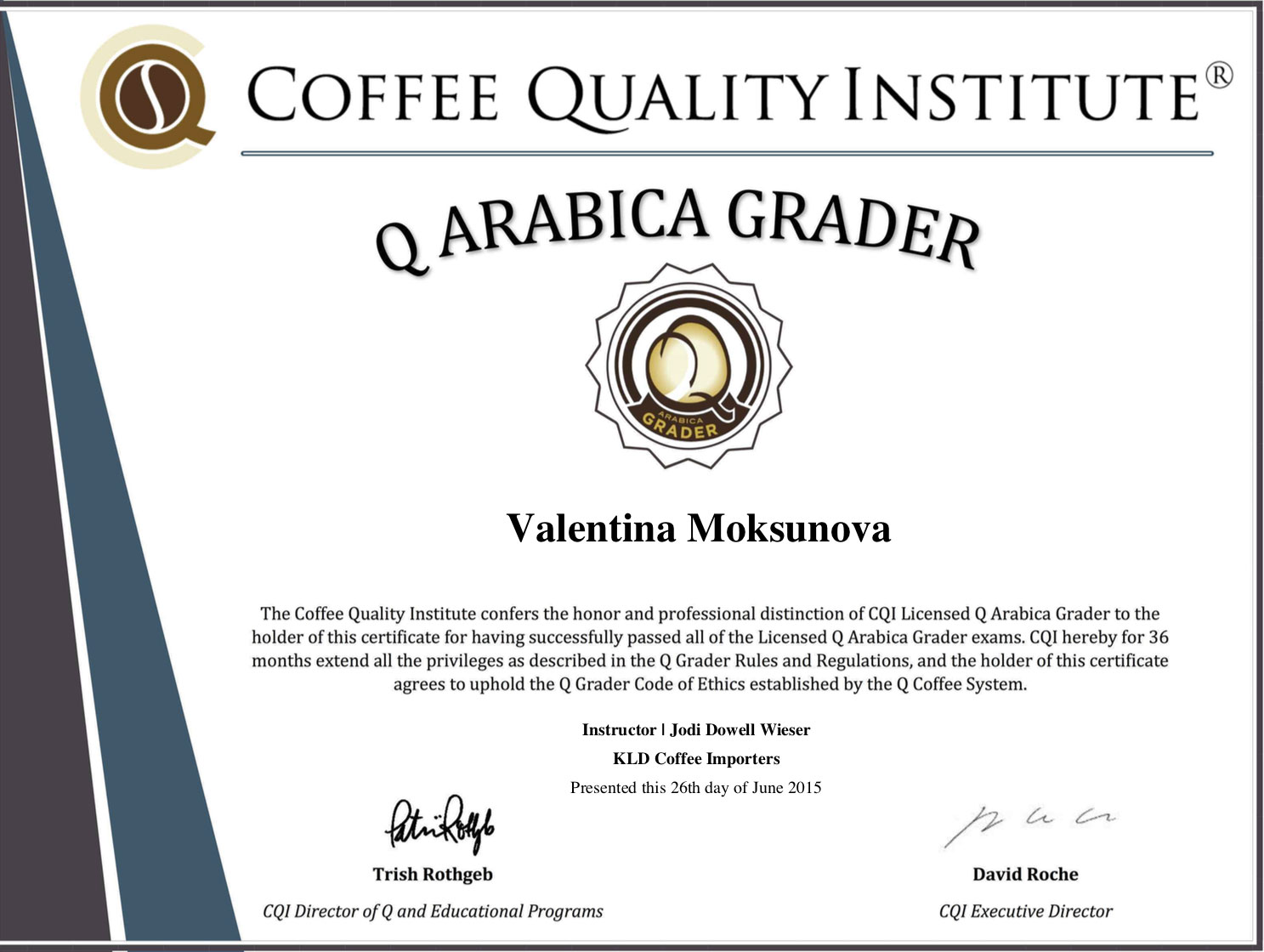 Сертификат Coffee Quality Institute подтверждающий, что Валентина Моксунова является Q-грейдером с 2015 года.