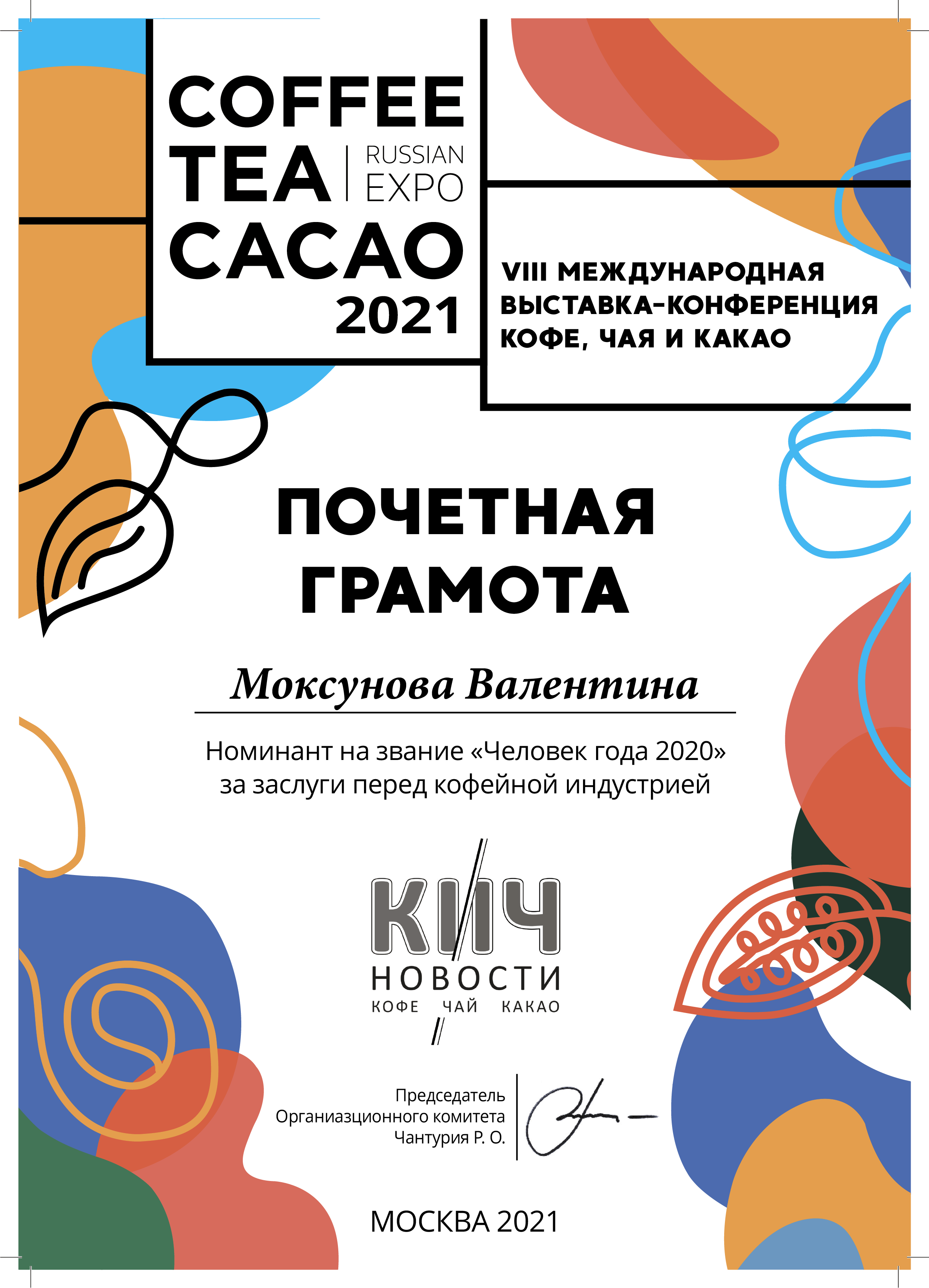 В 2020м году Валентина Моксунова стала номинантом на звание "Человек года 2020" за заслуги перед кофейной индустрией.