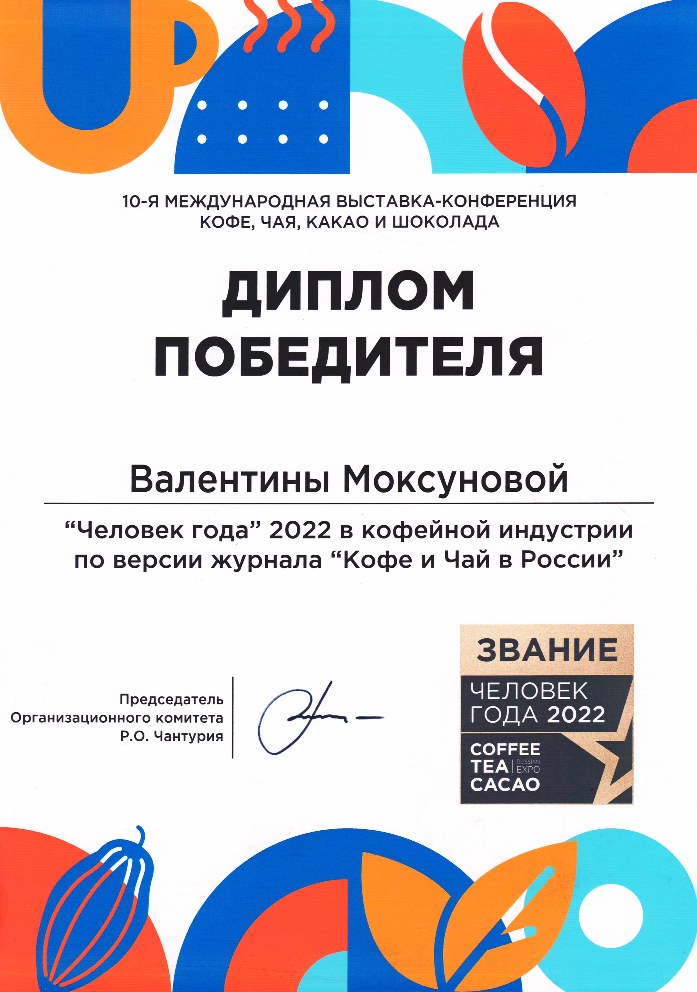 Валентине Моксуновой присвоено звание «Человек года» в кофейной индустрии за проведение образовательного проекта «Деревня обжарщиков» на международном уровне в Бразилии, создание калькулятора переговорщика и калькулятора успешного обжарщика (IT-инструменты для бизнеса).