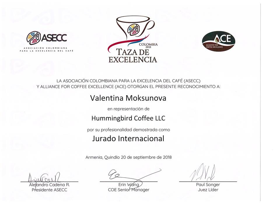 Сертификат подтверждающий участие Валентины Моксуновой в качестве судьи на конкурсе Cup of Excellence Colombia-2018.