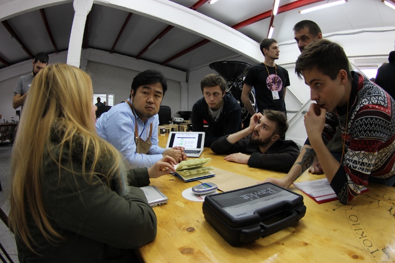 В теоретической части обжарщики разбирали построение профиля, важные параметры и их связи с отдельными компонентами вкуса. В качестве практики участники в командах обжаривали Эфиопию Коре Гедео натуральной обработки и Эфиопию Сидамо Бокассо Геджеба мытой обработки на Probat BRZ, Has Garanti, Giesen W1A, Giesen WPG1, а также Probat 12. Привычные для Деревни обжарщиков задания на обжарку нужно было выполнить учитывая заданные мастером параметры: вес загрузки, влажность и плотность зерна до и после обжарки, цвет зерен и цвет молотого кофе, дельту между ними, а также RoR на отдельных участках кривой. Хисаши Ямамото совместно с обжарщиками выбирал лучший профиль в каппинге, после чего батч передавали на настройку команде бариста. Задача бариста – настроить вкус, который в каппинге нашли обжарщики, выразить его максимально точно. Со стороны бариста Йошихару Сакамото комментировал полученные результаты и давал командам рекомендации.